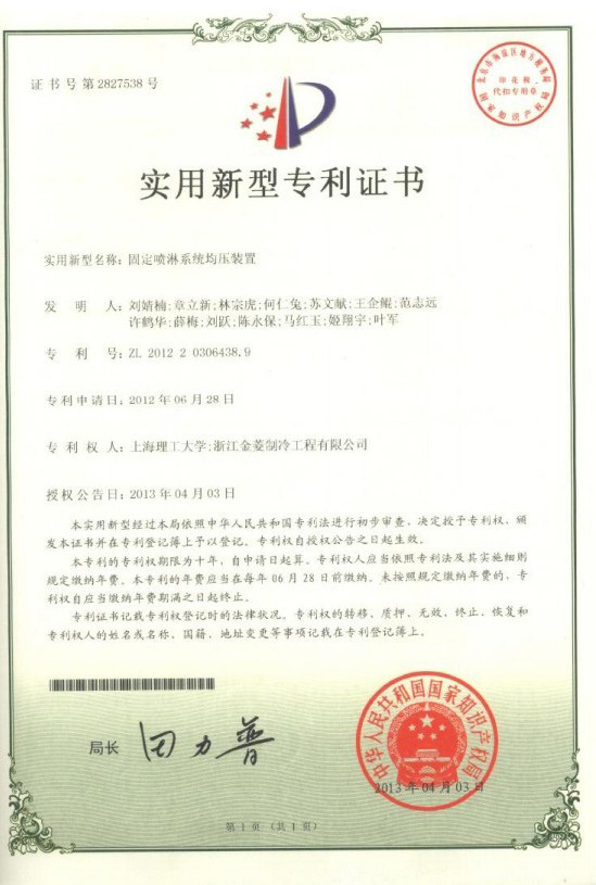 Patent certificate for a disturbance device used to reduce the phenomenon of water disk vortex in coo